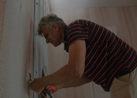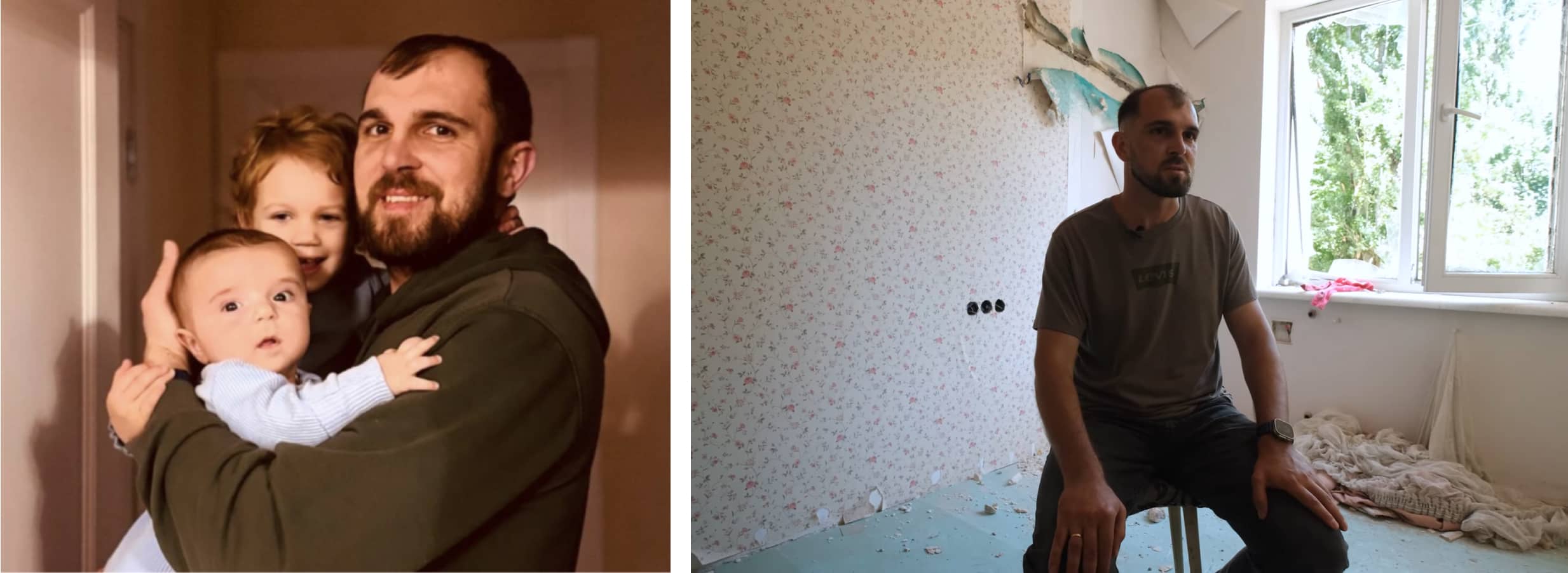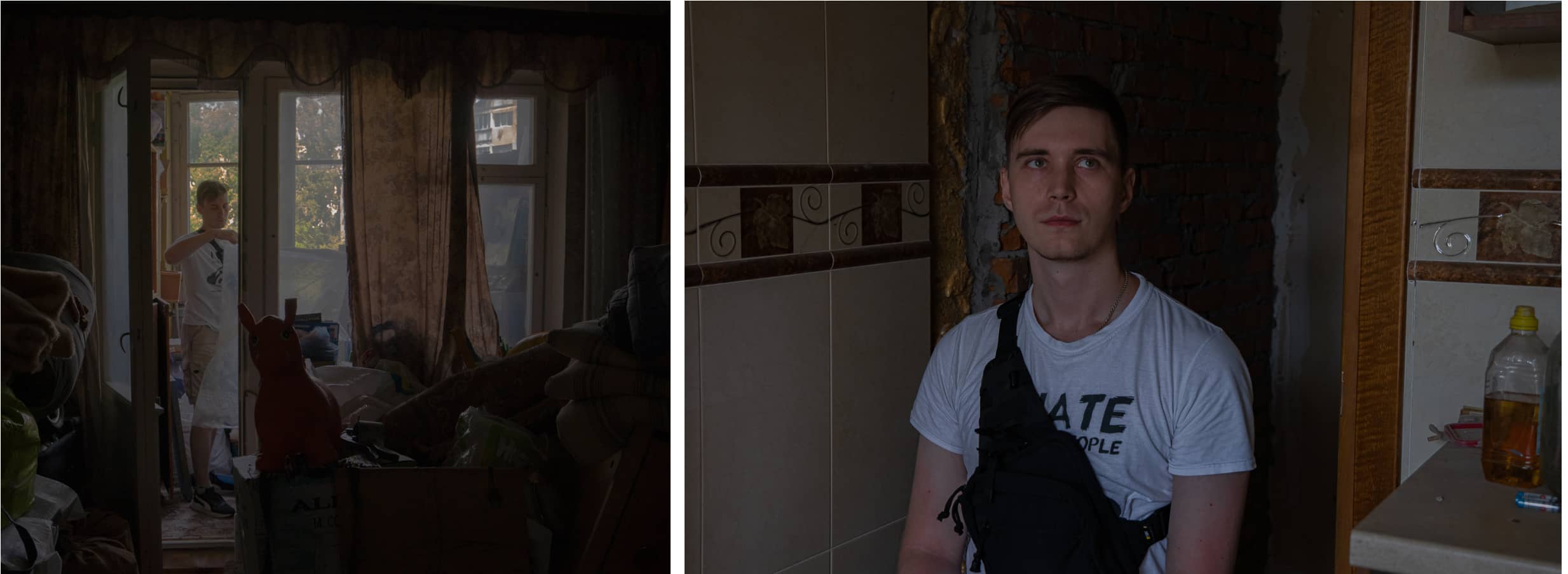 Володимир визирає з-під мотлоху. Він спокійно виміряє потрібну довжину клейонки та прибиває її до віконної рами. Це квартира його дідуся та бабусі, які давно померли. 2 березня тут постраждали лише вікна. Каже, що через постійний вітер скатертину зриває, тому приходиться щоразу вішати знову. Поверхом вище мешкав його батько Михайло з мамою Ангеліною та молодшою сестричкою. Після початку повномасштабного вторгнення батько відправив родину за кордон. Передчув і лишився на хазяйстві сам. Син Володимир в цій квартирі не живе з 2017 року відколи одружився. Тутешні стіни пам‘ятають і більш райдужні часи: дитинство, народження сестрички, застілля з рідними.