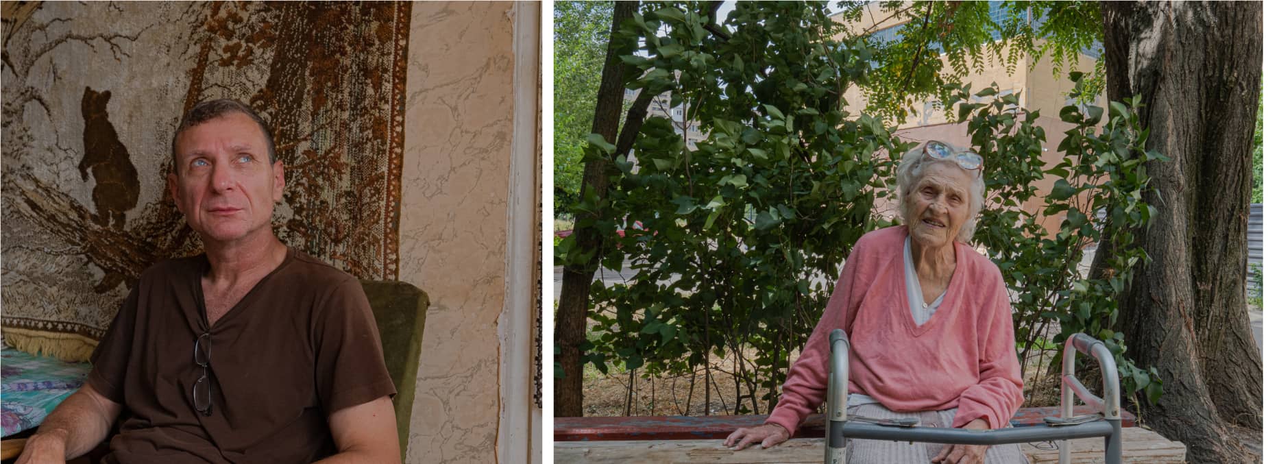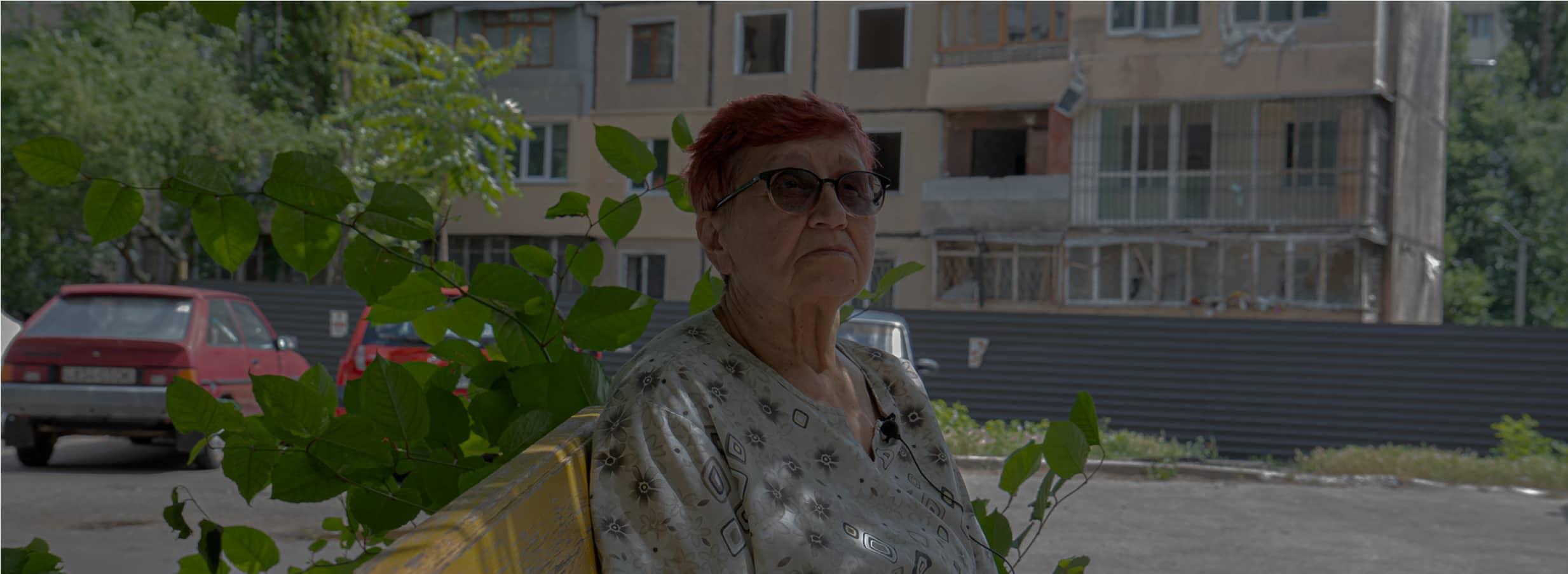 «Надічка, привіт», — вигукує бабуся з машини онука. Надія жила поверхом нижче. Вони не бачились вже декілька місяців, тому зараз наздоганяють втрачене. Говорять про інших сусідів: хто живий, хто загинув. Бабуся Надя переймається й іншим питанням, більш земним: чи виплатили сусідці компенсацію. Та каже, що поки в процесі. «Я так рада, що ти жива», — повторює довгожителька. Допоки онук займається справами в квартирі, старенька сидить в машині, а позаду неї зруйнований дім. Можливо, вона його і не бачить повністю. Лише відчуває.